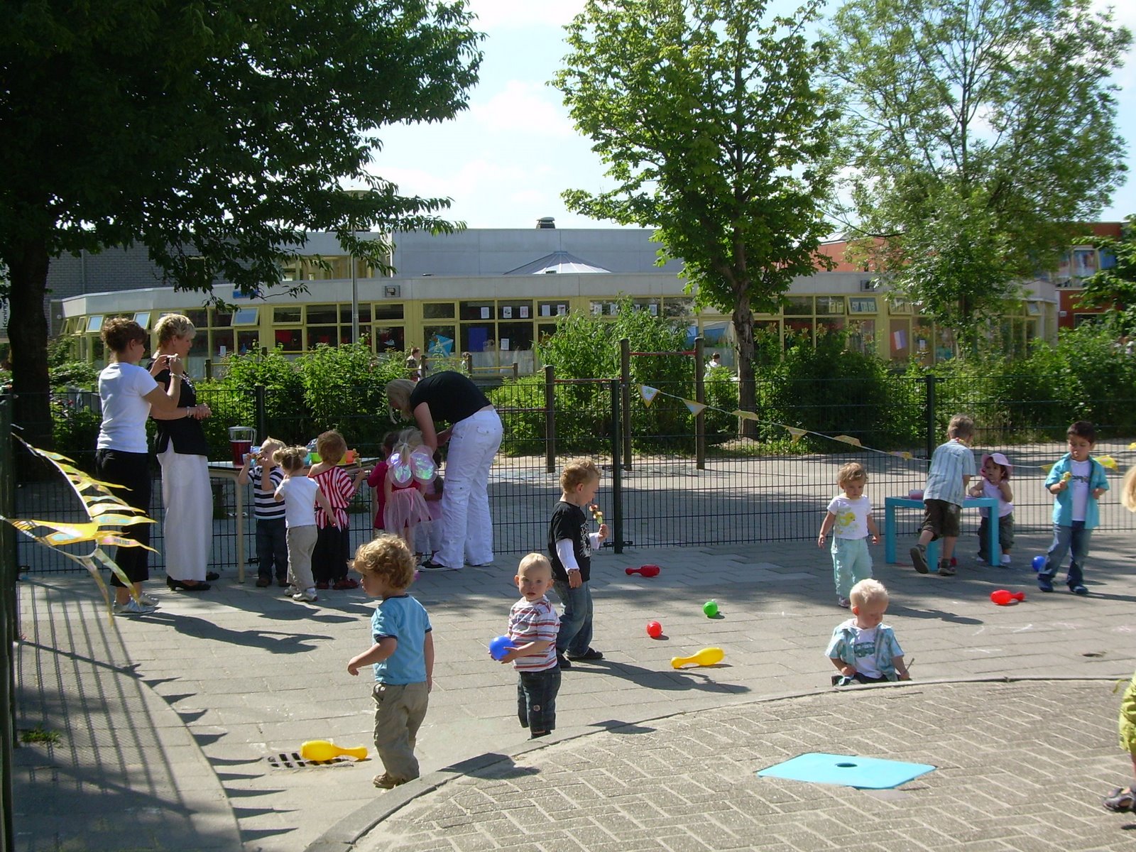 Op 15 september 2008 was het een jaar geleden dat Julikids Kinderopvang haar deuren opende. En dat hebben we uitbundig gevierd op zaterdag 20 september! Alle kinderen, papa's, mama's, oma's, opa's, broertjes en zusjes konden genieten van spelletjes doen, buttons maken, cake versieren, limonade tappen, schminken en nog kiezen uit lekkere hapjes en drankjes. Om drie uur hadden we het officiƫle gedeelte. Alle kinderen van Julikids Kinderopvang kregen een gele ballon gevuld met helium die we , na aftellen, de lucht in hebben laten gaan. Nadat de voorzitter van de oudercommissie, Richard Bosboom, een leuke speech had gehouden over de ontwikkeling van Julikids Kinderopvang werd het cadeau onthuld...........een mooie bolderkar gemaakt door Ed Cannemeijer (vader van Angelique). Alle kinderen waren erg enthousiast en sommige wilden alvast een ritje maken over het plein!